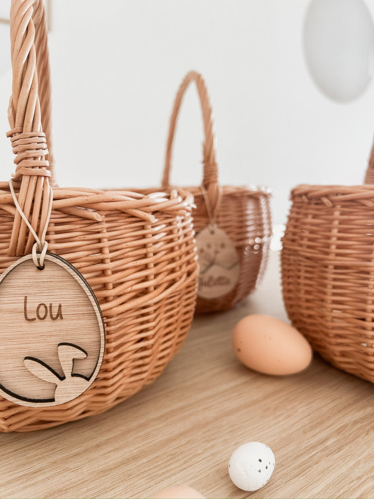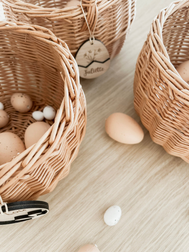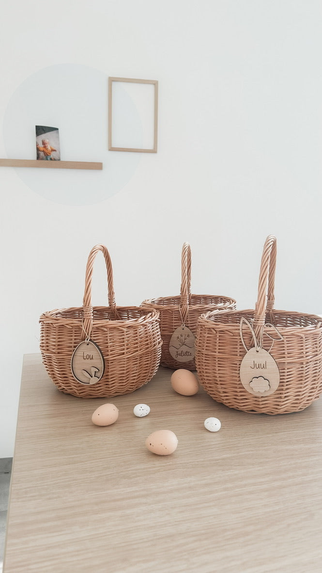 Laat jouw kindje dit jaar stralen met zijn of haar eigen rieten paasmandje met gepersonaliseerde houten hanger. Beperkte voorraad!